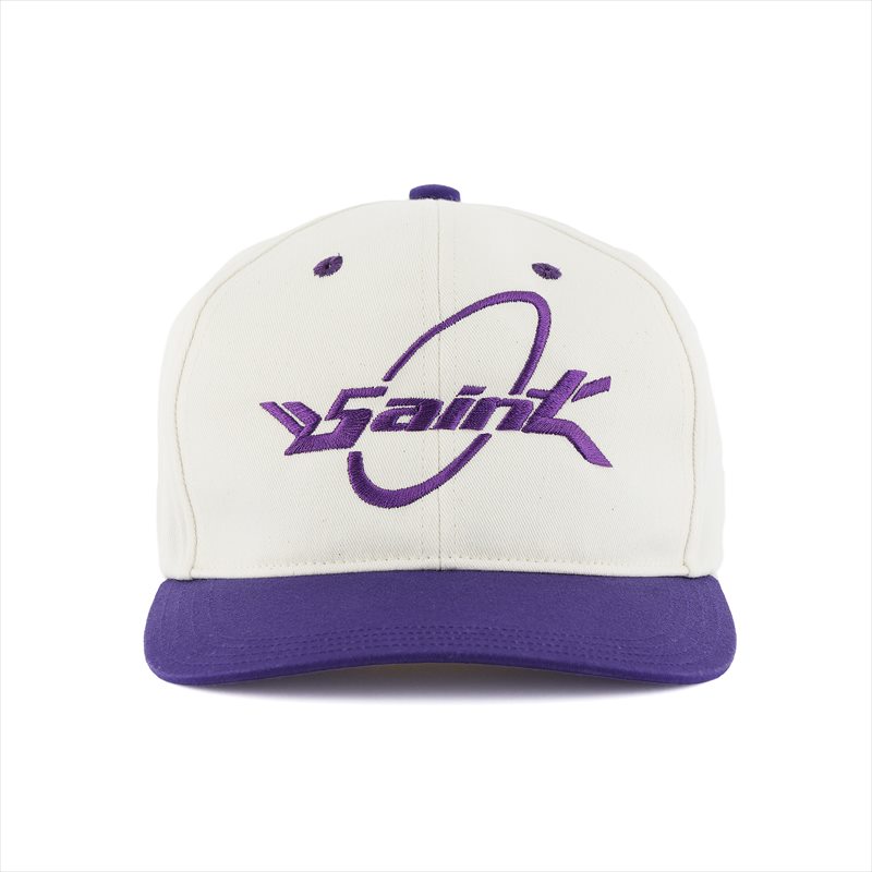 コットンで製作された©SAINT Mxxxxxx Cap S.Circle White Purple (キャップ)。 フロントにSaintロゴの刺繍が施されております。