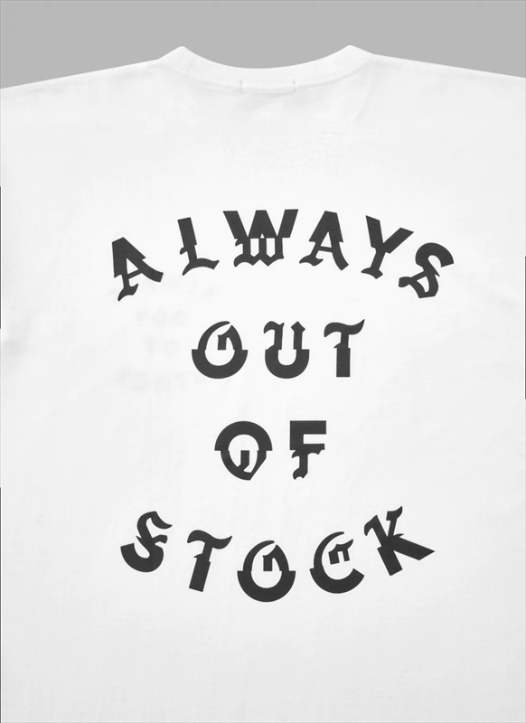 ドロップショルダーボディで製作されたALWAYS OUT OF STOCK Switghed Front Tee (Tシャツ)。 左胸とバックに「ALWAYS OUT OF STOCK」ロゴ、右袖にバラモチーフのプリントが施されております。 ボディは、現在では殆ど生産工程として行わない丸セット、丸裁断を経て生地のクオリティーを最大限に引きだす方法で製造しております。